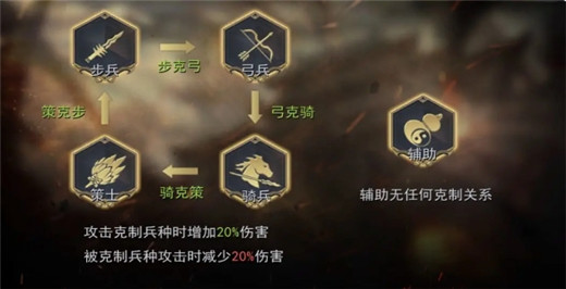 游戏中的兵种分为步兵、弓兵、骑兵、策士以及辅助五种兵种,五行之中环环相克,游戏中的克制链为:步兵->弓兵->骑兵->策士->步兵,其中辅助无克制关系,主公需要针对敌对玩家的阵容搭配武将。