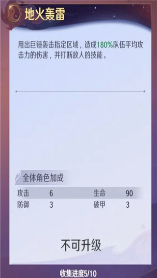 输出型合击技,伤害也是比较可观的,因为其是造成“百分之180的队伍平均伤害“,换一种说法就是阵容伤害越高,”地火轰雷”造成的伤害就越高。