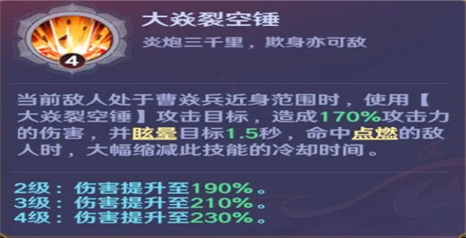 该技能需要敌人处于曹焱兵附近时才能使用,虽然触发条件苛刻一些,但其技能效果不差,有一个眩晕的效果并且时间长达1.5秒。该技能主要是在局内曹焱兵放置在前排或者在后后排被敌让勾过去的时候作用突显明显。