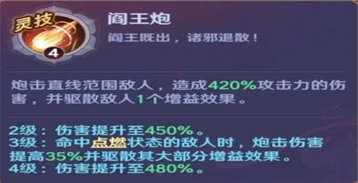 看这个技能的字面意思相信大家就能知道其伤害绝对不低,事实上也确实如此,能在造成高额伤害的同时驱散敌人的一个增益,在阎王炮达到3级时候驱散的增益就会变多,间接降低了敌方的输出能力。