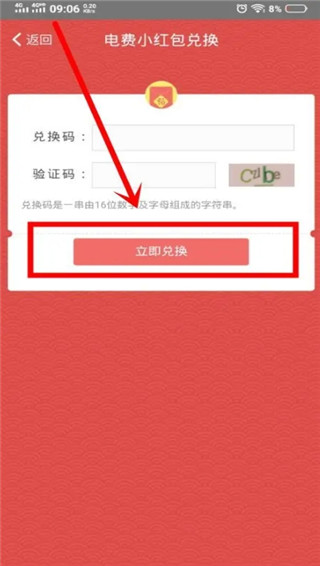 最后,我们在电费小红包兑换这个页面输入信息,点击立即兑换按钮。