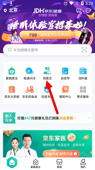 1.我们在首页上可以看到其对应的找医生功能,点击进入其中。