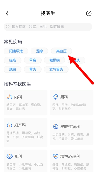 2.然后我们需要输入疾病、科室或医生等内容进行搜索,也能选择不同的疾病来让平台推荐医生,这里就以高血压为例。