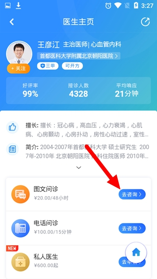 3.此时会给我们推荐许多医生,我们随意点击一个进入其详情节目,可以选择图文问诊、电话问诊等多种路径,点击咨询后即可开始看病了。