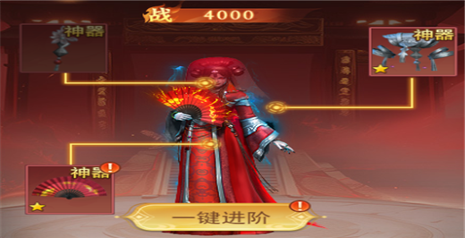 每一位神将都可以装备三件专属神器,神器激活后可继续获得相同神器进行进阶,不断提升战力,神器可通过召唤或后续其他活动获得