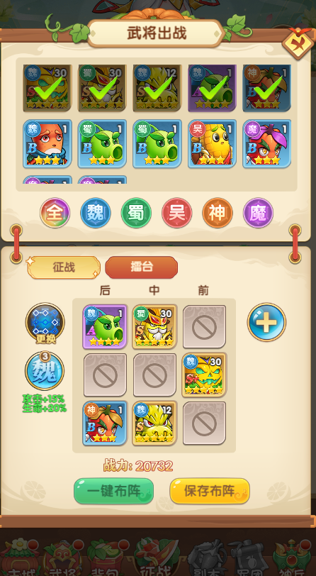 上阵指定阵营的武将也可在战斗中获得属性加成,根据首岂包肴有的武将合理搭配阵型也能大福提高胜率屹;真体搭配可在[武将出战]面板中点击阵营图标查看