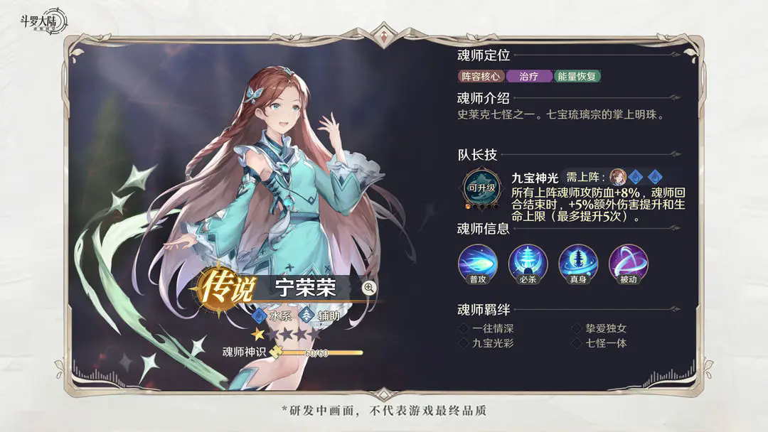 宁荣荣必杀可提供高额的续航,武魂真身可提供伤害减免,比较适合用来前期攻坚。在中期可利用宁荣荣、尘心构筑生存队,在打部分高难副本时也可将宁荣荣加入到任意阵容中提供治疗、减损。