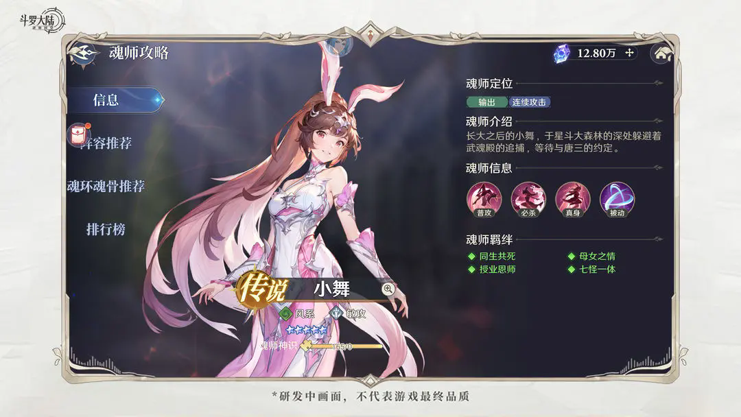 小舞是首冲赠送,获取门槛很低。其必杀拥有60%的暴击率,在前期拥有很强的单体突破能力;武魂真身下暴击可触发追击,平民玩家可以先把小舞养起来用来推图、副本。