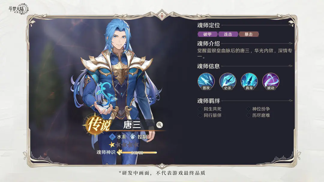 唐三是目前最强的输出核心之一,武魂真身下可大幅提升暴击率,必杀在造成暴击时可吸取目标武魂值,限制敌方输出(自身也可更快进入武魂真身);唐三比较吃练度,激活蓝银护体后可免死一次并回复大量生命值,激活武魂护体可拥有高额减伤及治疗。在后期唐三可集爆发、生存于一体,有条件可以优先养成。