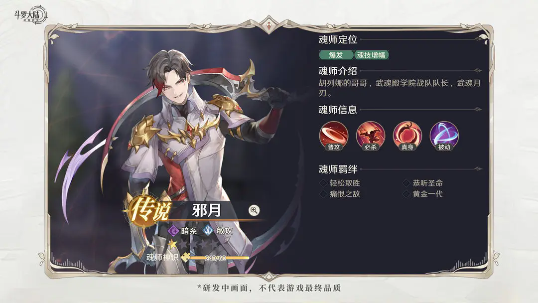 邪月在武魂真身状态下可提升暴击率,并且对于血量较低的敌人拥有额外的增伤。邪月必杀倍率本身比较高,还能对血量低于50%的目标额外造成巨额的伤害,很适合用来打收割。开荒期如果能快速令敌方核心减员,可提升整体队伍的攻坚能力。