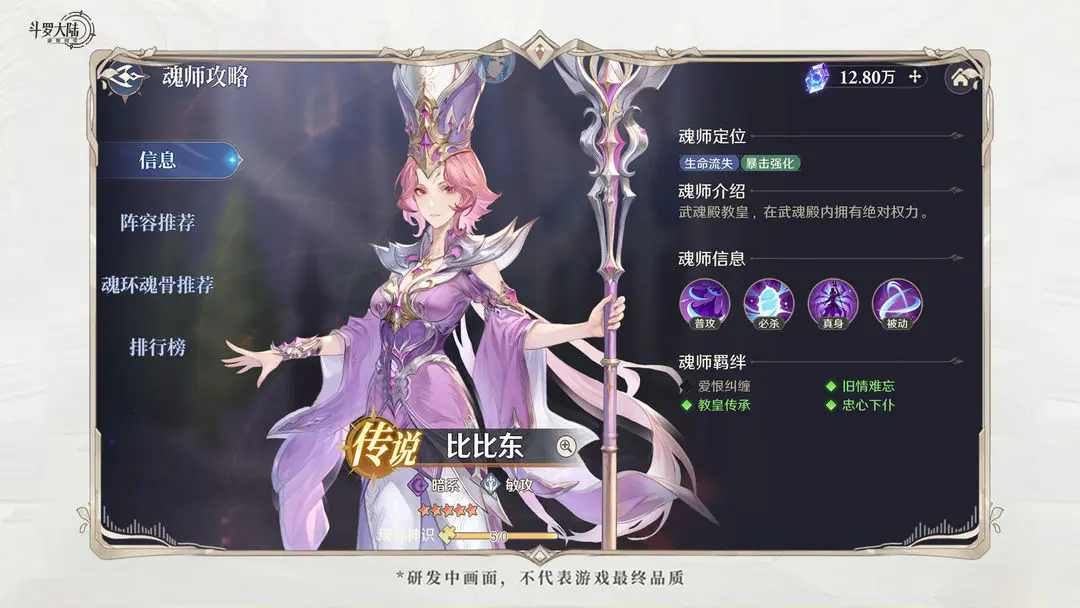 比比东是狂暴系的核心,必杀可对生命值最低的目标造成高额伤害并附加生命流失效果,拥有很强的单体输出能力。在武魂真身下每损失10%生命,可提升7%暴击、暴伤,是后期最具输出潜力的魂师。在后期练度提升后,可通过被动技能获得高额的护盾,即便在低生命值时也能有较强的站场能力。