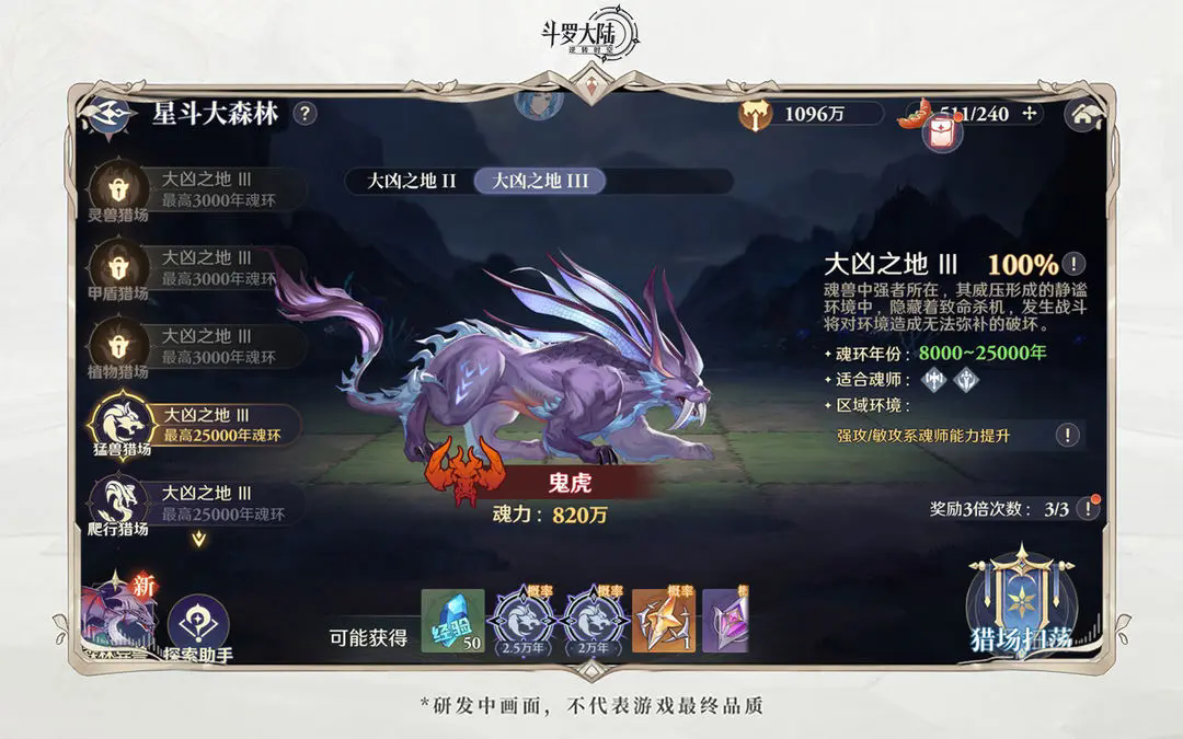 魂环年限的属性差距很大,而且通过淬炼魂环可大幅提升战力,这就导致我们初期有巨大的资源缺口。猎场每天有3次3倍奖励的机会(月卡额外+1次),建议每天打满,前期可适当购买体力扫荡猎场,来获取更多的魂环。