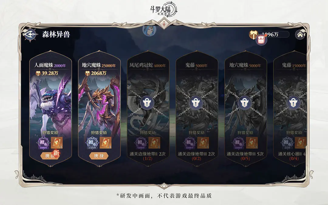 森林异兽相当于额外的“挑战”成就,在我们通关猎场时会解锁相应的异兽挑战,完成狩猎可获得魂环及魂师召唤券。在进入游戏后我们除了要推进主线章节,推进星斗大森林还能帮我们多抽几次卡。