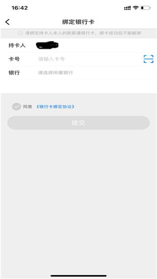 4、在绑定页面输入相关的信息,持卡人,卡号和银行,然后点击提交即可