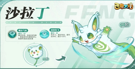 一只长在树木较多的风之地的精灵,会在蒲公英丛中隐藏自己,看着却像一团青苹果味道的棉花糖,据说会随气流抵达风所至的所有地方。据说如果有人能恰巧遇到波波丁被吹散的绒毛,之后的一段时间或许会迎来好运……若是遇到金黄色的波波丁,还将收获完美的爱情。进化后的沙拉丁拥有了短时间在地面活动的能力,却因为身体太轻,小小一阵风就会将它吹跑。有风来时,它会展开翼膜在空中滑翔,并在遇到危险时将翼膜还原成绒毛喷发而出,迷惑敌人。