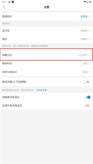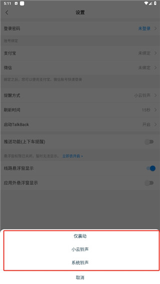 从系统铃声、小云铃声、仅震动中选择你需要的到站提醒即可