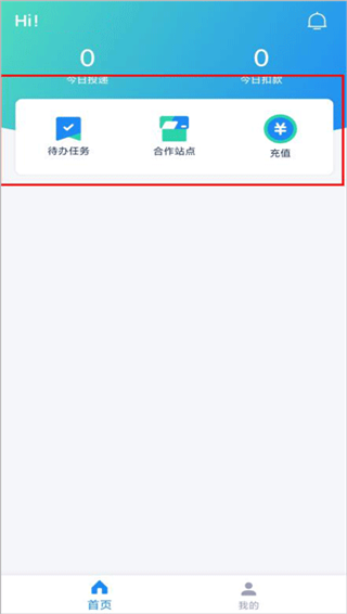 1、进入软件的主页面,在这里可以查看今日投递和今日扣款,了解当天的营收,还有着待办任务,合作站点和充值三个功能