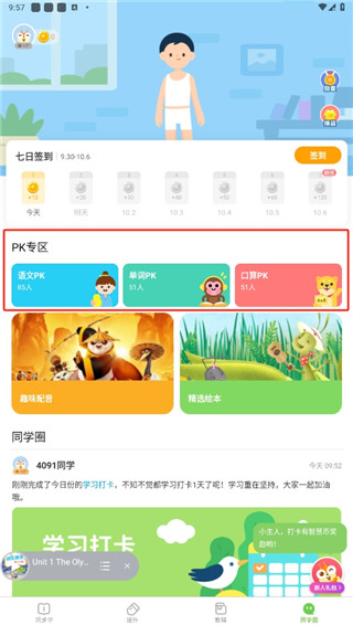 4、同学圈内置了签到、pk、配音绘本等多种有趣的学习功能,让你爱上学习