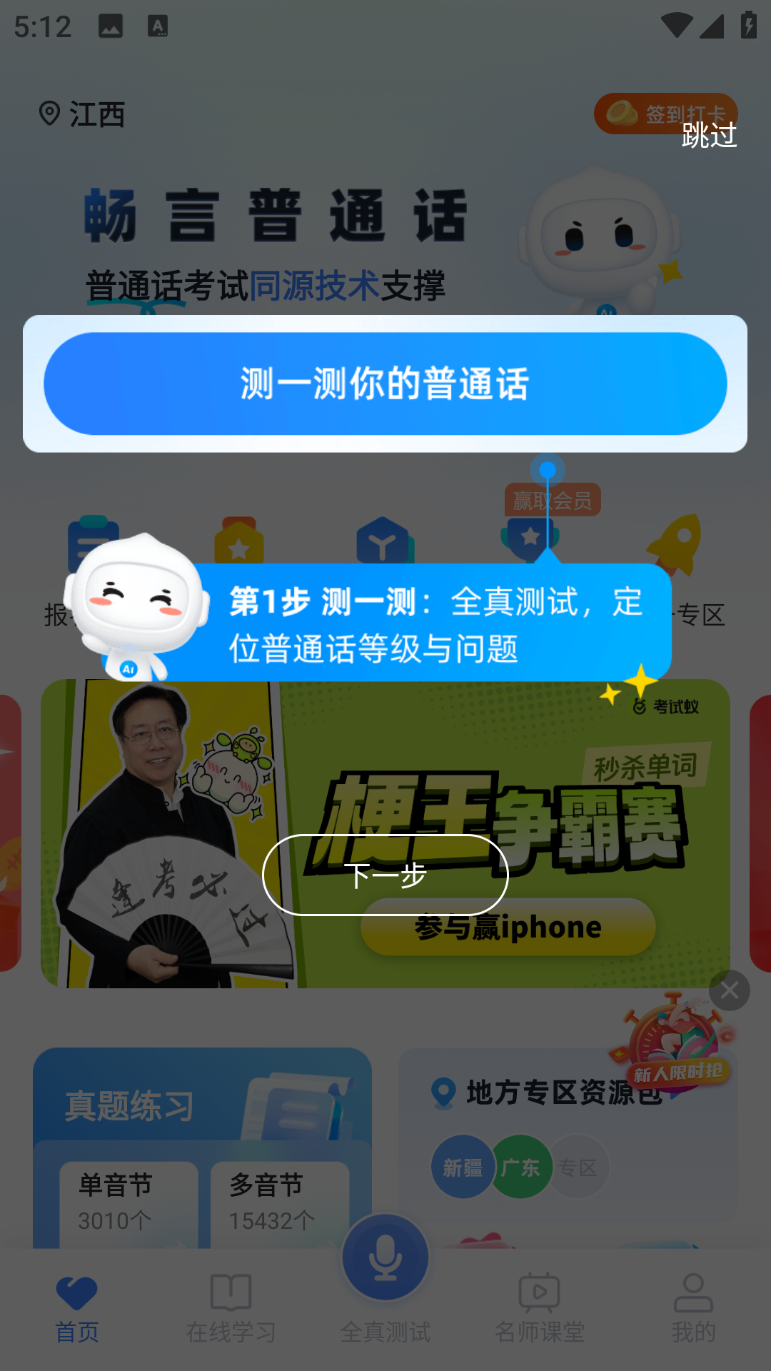 1、在首页中,可以一键测试你的普通话水平,以便有更针对性的练习。