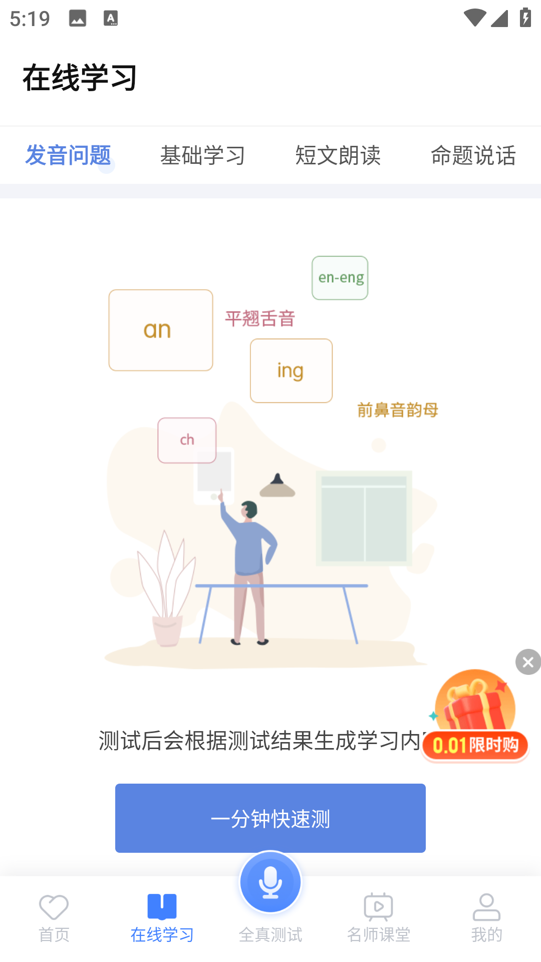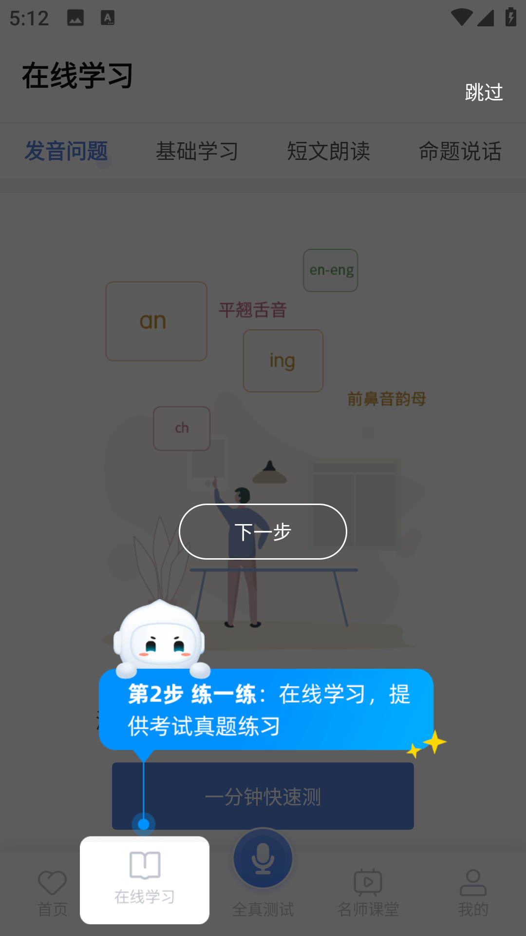 2、在线学习板块中,拥有改善发音问题、短文朗诵练习和命题说话等练习功能。