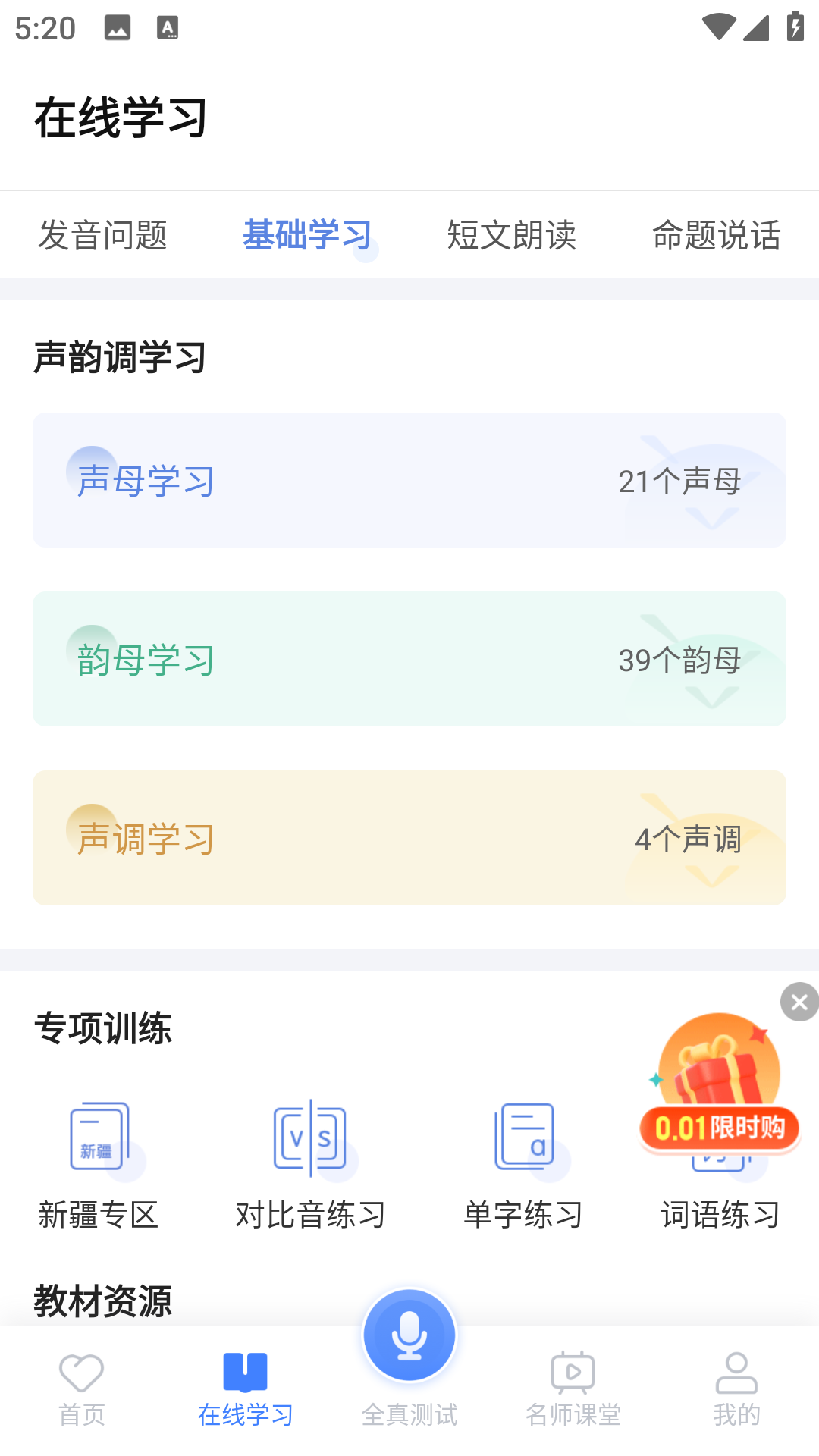 2、在基础学习中可以看到声韵调学习和专项训练。