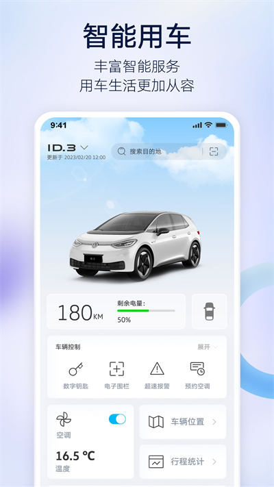 上汽大众app官方版是一款为大众汽车打造的智能车辆网软件,其支持连接多款大众匹配汽车,如朗逸新锐、凌度、帕萨特、途观等,用户可以使用软件实现车辆与手机的连接。软件支持智能控车服务,用户可以远程控制车辆,如启动车辆、开启空调、车门上锁等,并且还可以通过手机查看车辆的油量电量、胎压、公里数等信息,帮助用户更好的管理车辆。