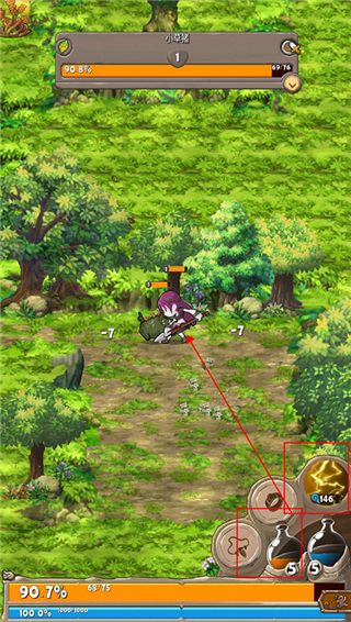7、玩家移动到怪物身旁就会进入战斗页面,角色会自动进行攻击,玩家可以点击右下角使用技能以及补血药品。