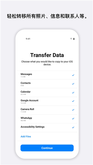 近期,新一代的苹果手机发布,很多曾经使用安卓手机的用户选择购买,不过因为安卓手机与iOS设备系统的不同,两者之间的数据很难传输,而旧的安卓手机中又有着很多重要文件,这样用户在使用的时候就需要不断切换手机,非常的麻烦,为此,小编为大家带来了转移到ios官方版,这是一款非常好用的数据迁移工具,能够帮助用户将安卓手机中的文件数据无损迁移到iOS设备,如联系人,短信,音乐,视频,图片,文件,软件等,实现一键迁移,非常的方便快捷。