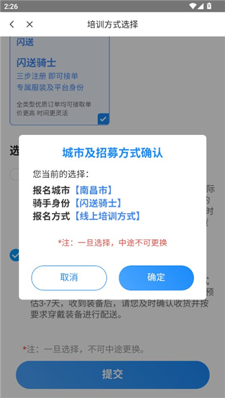 4、选择培训方式,线上培训需要在软件中完成培训开始,线下则是需要预约和参加站点培训,完成之后就可以开始配送了,不过选择培训方式之后中途无法更换,选择的时候一定要根据实际情况来选择