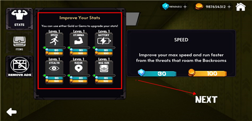 2、游戏前的准备,我们可以在左侧消耗金币或是钻石来提升角色的属性,完成之后点击NEXT下一步