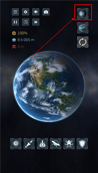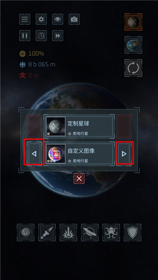 2、进入游戏之后,点击右上角的图形可以唤起功能菜单,在这里可以进行定制星球,通过左右箭头来选择星球的形状