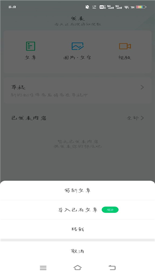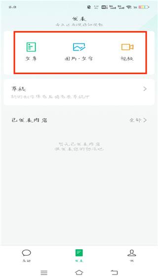 2、选择要创作的类型,文章,图片/文字,亦或是视频,小编选择的是文章,在弹出的选项中选择写新文章,点击进入编辑页面
