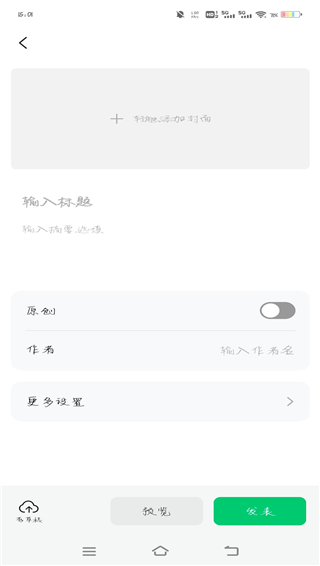 4、添加文章的封面和标题,选择是否是原创内容,变填写作者的名称,完成之后点击发表即可