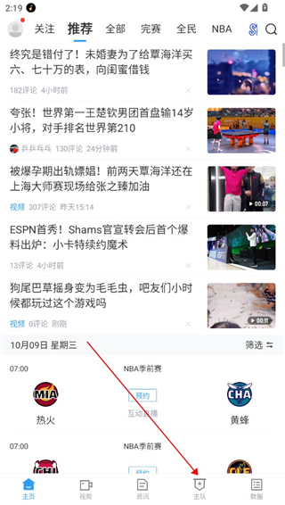 2、软件的主页面会推送各种资讯内容和赛事预告,点击下方功能栏中的球队
