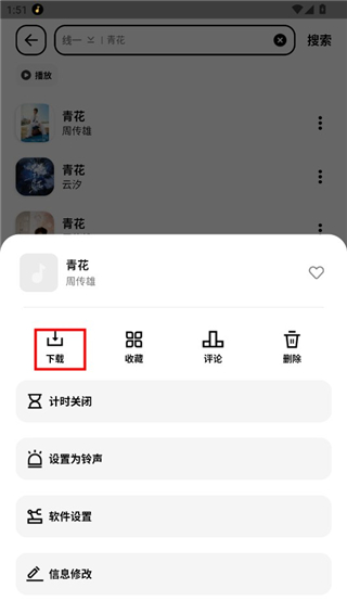 2、在众多歌曲中找到想要的歌曲,点击右侧的三个点可以唤出菜单选项,在菜单中点击下载