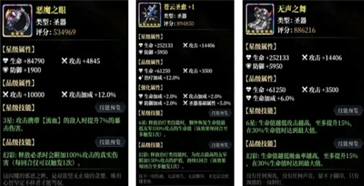 拿改瓦伦丁、特蕾莎、伊莎贝拉来说,这三位最适合的圣器分别是【恶魔之眼】、【苍云圣愈】、【无声之舞】,属性加成如下图所示。然后这个【恶魔之眼】后面也可以给到阿鲁卡多使用。