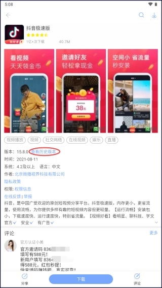 2、进入应用的详情页,随后点击版本旁边蓝色字体的查看历史版本。