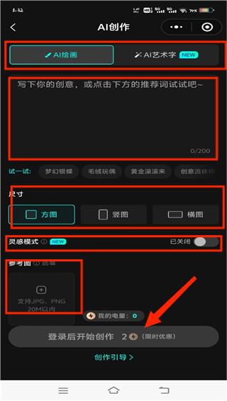 2、选择创作的类型,AI绘画或是AI艺术字,然后输入创意或是使用下方的推荐词,选择尺寸,方图,竖图,横图等,选择是否开启灵感模式,添加参考图(可以不添加),点击开始创作