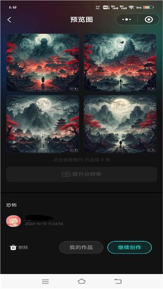 此外在文心一格中,会自动将用户生成的作品进行保存,方便用户以后查看,需要注意的是,有时软件生成的作品清晰度可能会有一定的问题,用户可以在下载之前选中并使用“提升分辨率”功能,可以极大的提升作品的清晰度。
