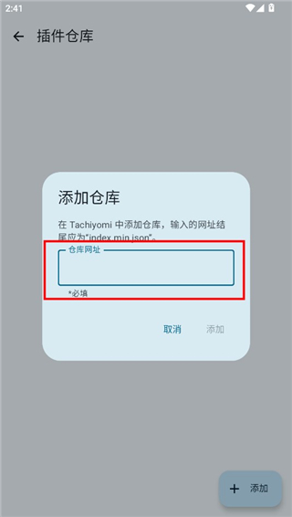3、在插件仓库中点击右下角进行添加网址(例:https://raw.githubusercontent.com/keiyoushi/extensions/repo/index.min.json)