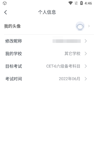 2、接着在个人信息里,你可以看到现在的考试级别是四级,这里有个地方可以让你改考试的目标。