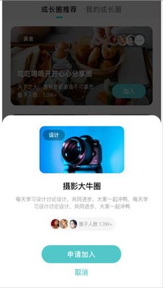 2、找到自己喜欢的成长圈,点击会出现申请弹窗,点击申请加入