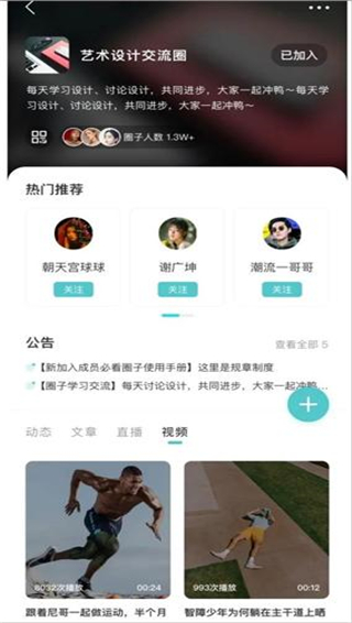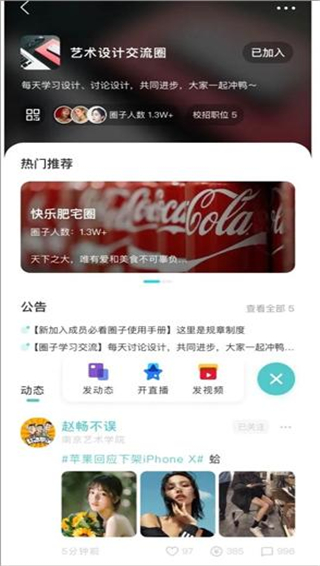 3、加入成功之后你就可以在这里查看其他用户的动态,也可以自己发动态,开直播,发视频等