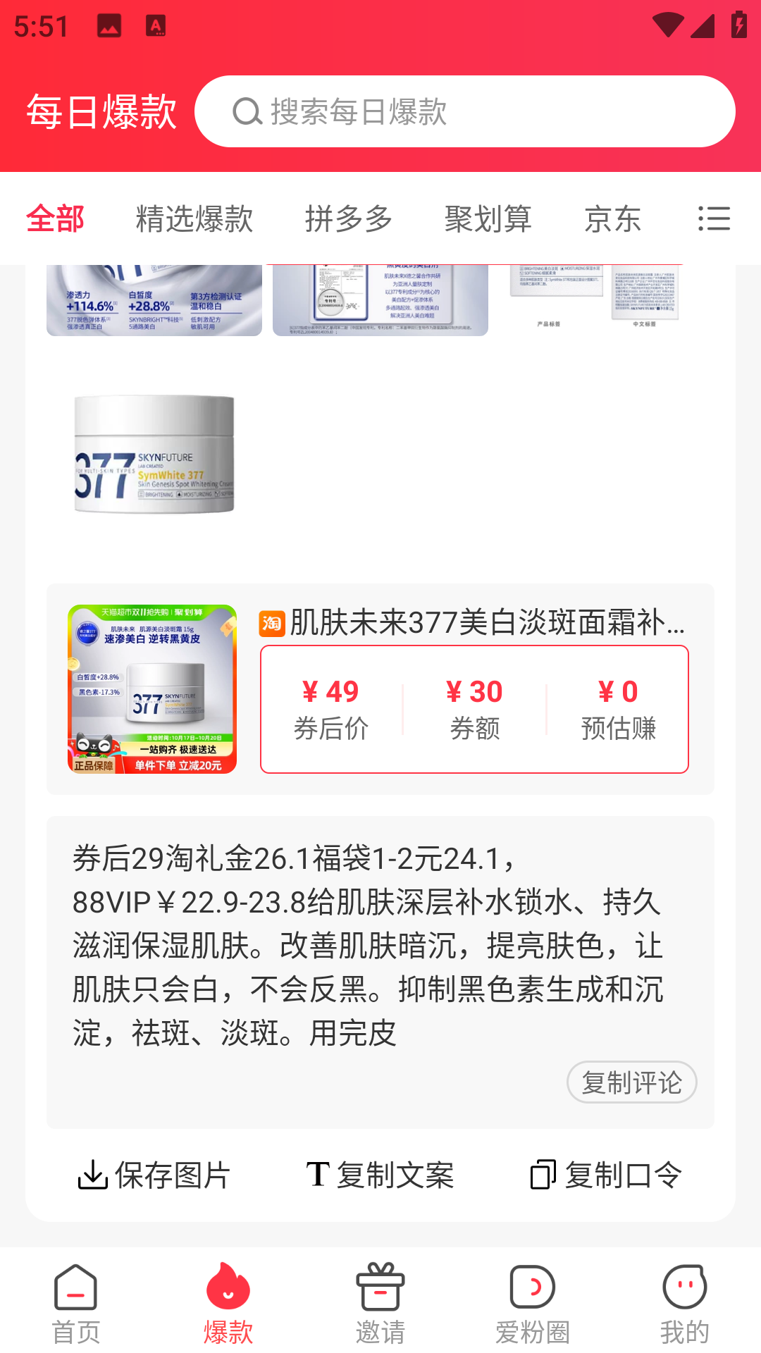 3、在爆款中,每天都会推荐许多爆款好物,你还能分享你的口令,其他用户下单后你还可以赚取佣金。