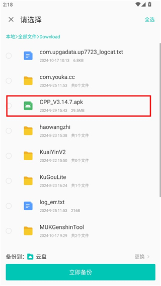 3、在文件夹中找到对应的文件,小编以apk文件为例,选中之后点击下方的立即备份,等待上传之后回到云盘页面,就可以看到备份的文件了