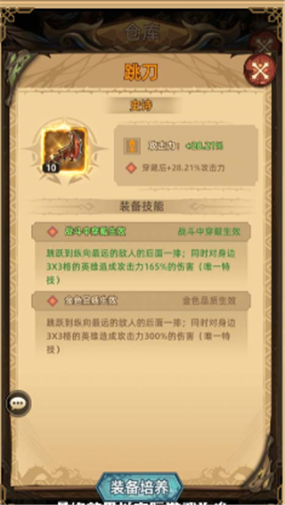 通关1-4boss关解锁的玩家可携带装备进行战斗、提升穿戴者大量属性和特殊技能,装备可通过升品养成来提升属性数值和技能效果