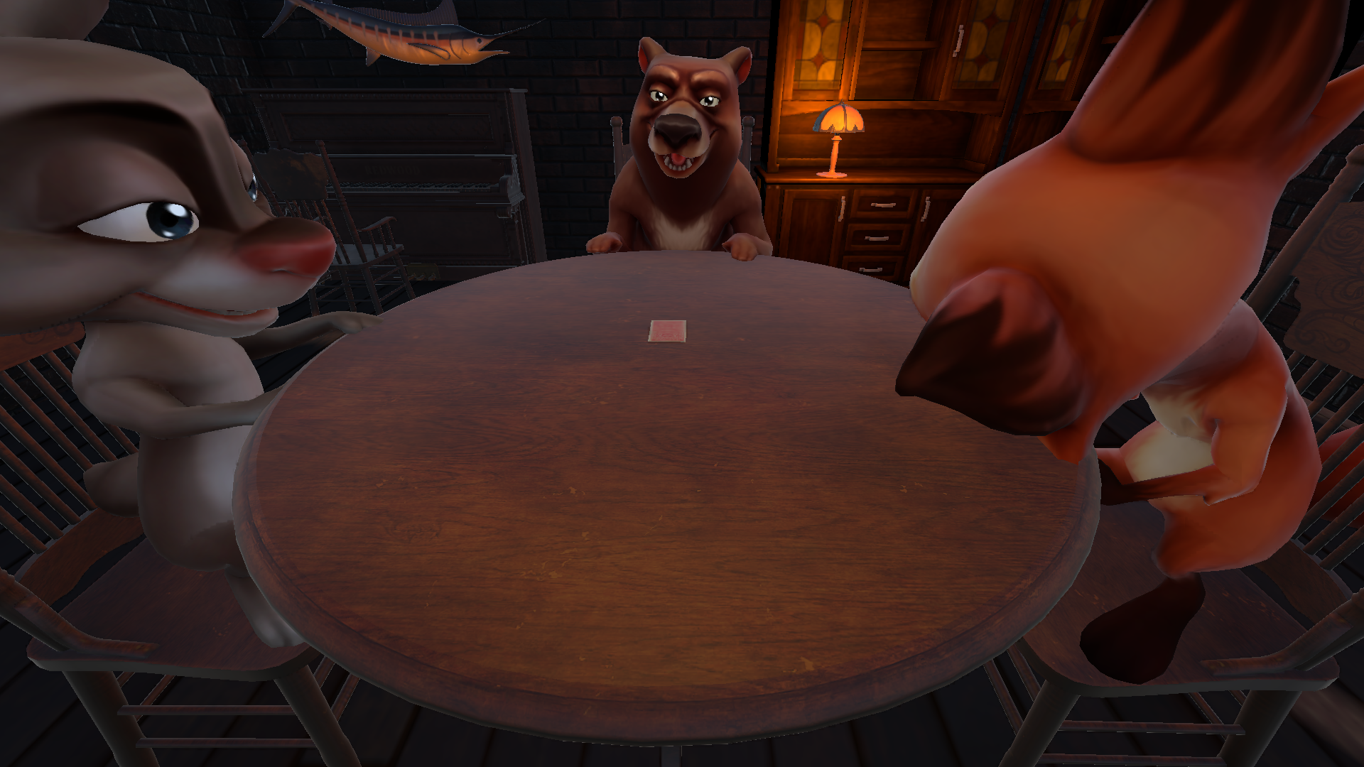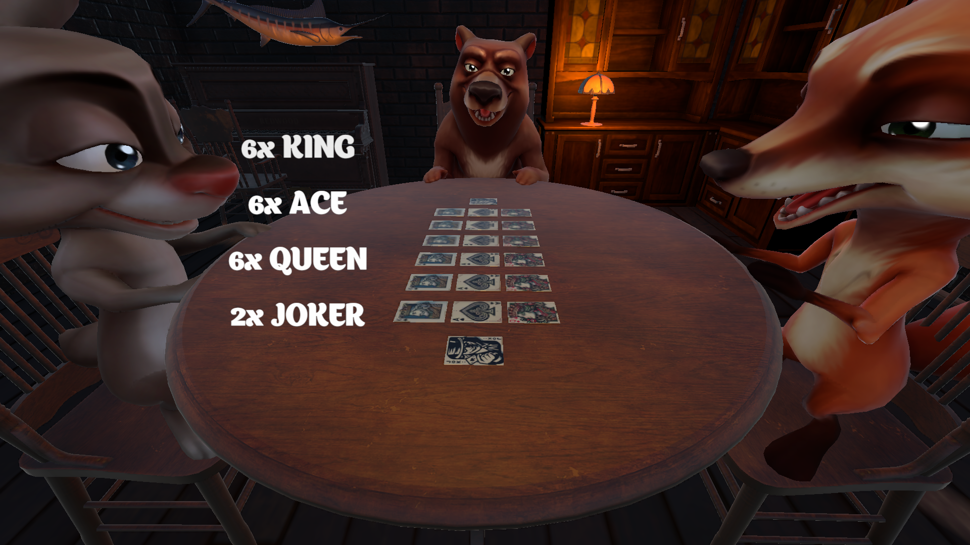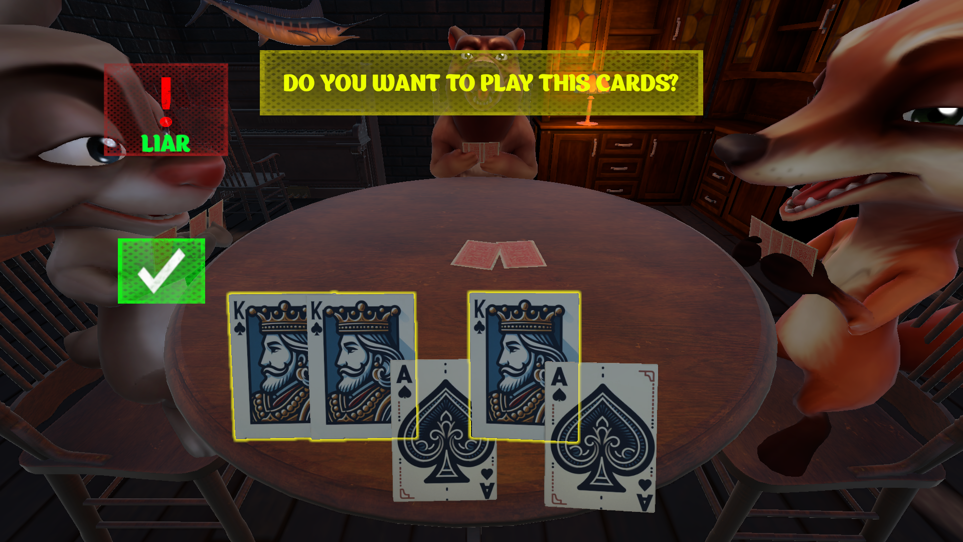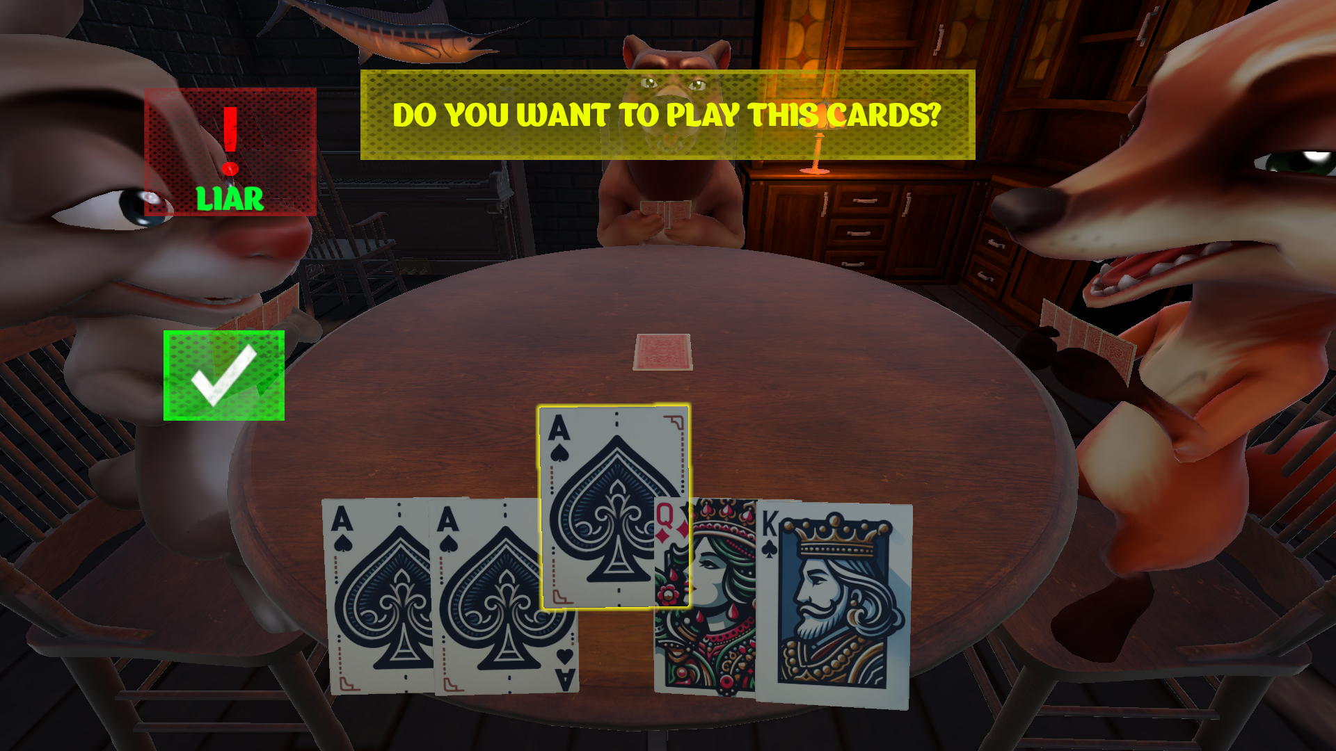 5、如果你怀疑别人出的牌是错的,可以点击牌,让它翻面,如果是正确的则你需要进行轮盘射击,如果错误则对方接受惩罚。