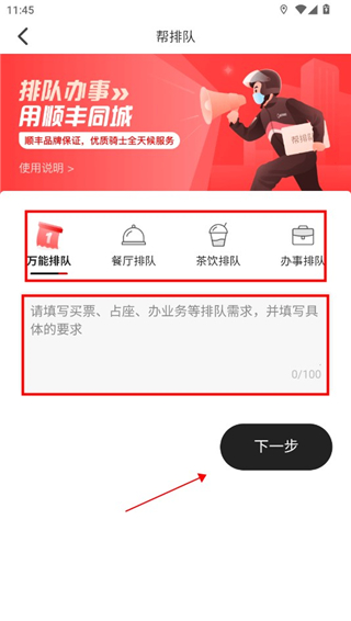 2、选择排队的类型,并填写关于排队业务的具体要求