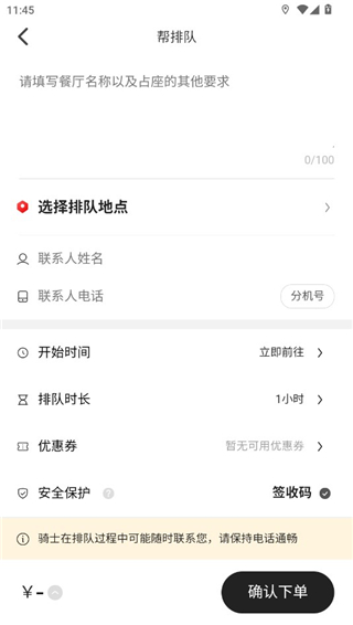 3、填写详细信息,在这里填写有关的详细信息,如地点,联系人,开始时间等,完成之后点击下单
