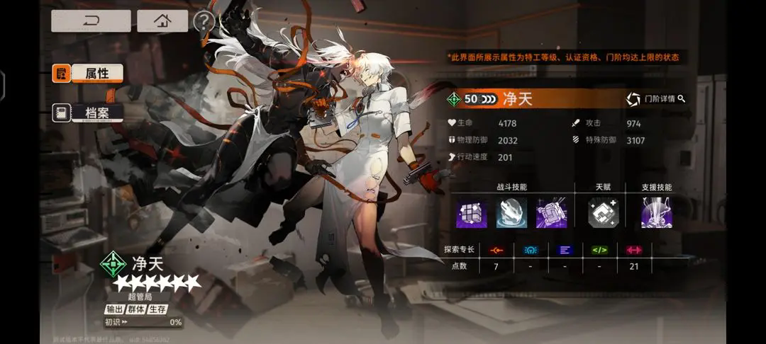 净天是一个比较全面的角色,无论是输出还是生存能力都不俗,唯一缺点换形态会缺少输出机会,兽主形态对群体的输出及其恐怖,能额外获得攻击提高,并且生命值低于50%以后双暴提升也很夸张,一门后就有50%双暴提升,不过烧血需要队友援护防御保证血线,卡带也是选择恶灵公馆